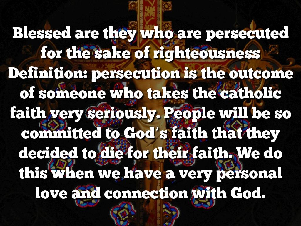 Blessed are they who are persecuted for the sake of righteousness Definition: persecution is the outcome of someone who takes the catholic faith very seriously. People will be so committed to God’s faith that they decided to die for their faith. We do this when we have a very personal love and connection with God.