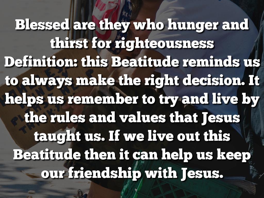 Blessed are they who hunger and thirst for righteousness Definition: this Beatitude reminds us to always make the right decision. It helps us remember to try and live by the rules and values that Jesus taught us. If we live out this Beatitude then it can help us keep our friendship with Jesus.