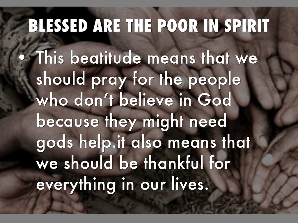 • This beatitude means that we should pray for the people who don’t believe in God because they might need gods help.it also means that we should be thankful for everything in our lives.