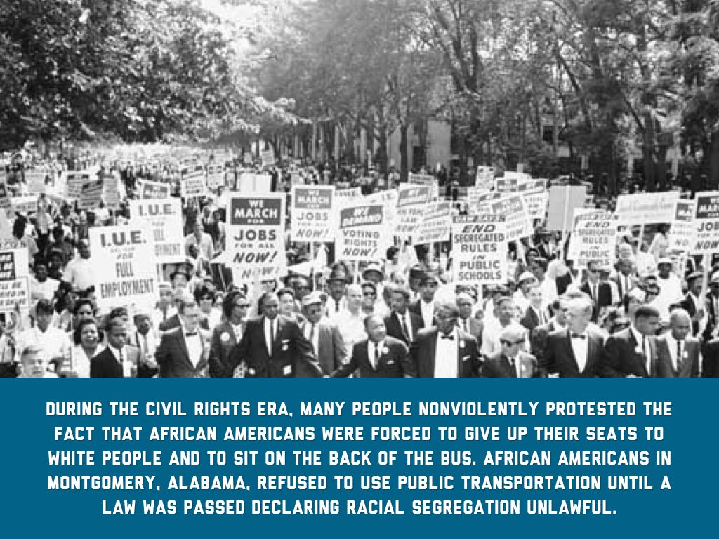 DURING THE CIVIL RIGHTS ERA, MANY PEOPLE NONVIOLENTLY PROTESTED THE FACT THAT AFRICAN AMERICANS WERE FORCED TO GIVE UP THEIR SEATS TO WHITE PEOPLE AND TO SIT ON THE BACK OF THE BUS. AFRICAN AMERICANS IN MONTGOMERY, ALABAMA, REFUSED TO USE PUBLIC TRANSPORTATION UNTIL A LAW WAS PASSED DECLARING RACIAL SEGREGATION UNLAWFUL.
