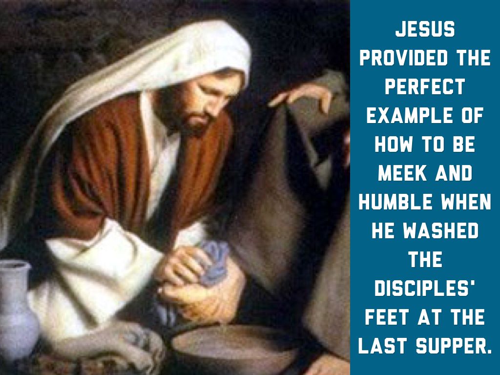 JESUS PROVIDED THE PERFECT EXAMPLE OF HOW TO BE MEEK AND HUMBLE WHEN HE WASHED THE DISCIPLES' FEET AT THE LAST SUPPER.