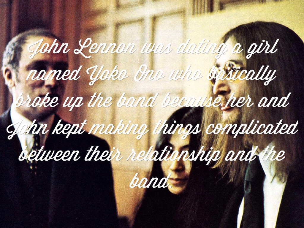 John Lennon was dating a girl named Yoko Ono who basically broke up the band because her and John kept making things complicated between their relationship and the band.