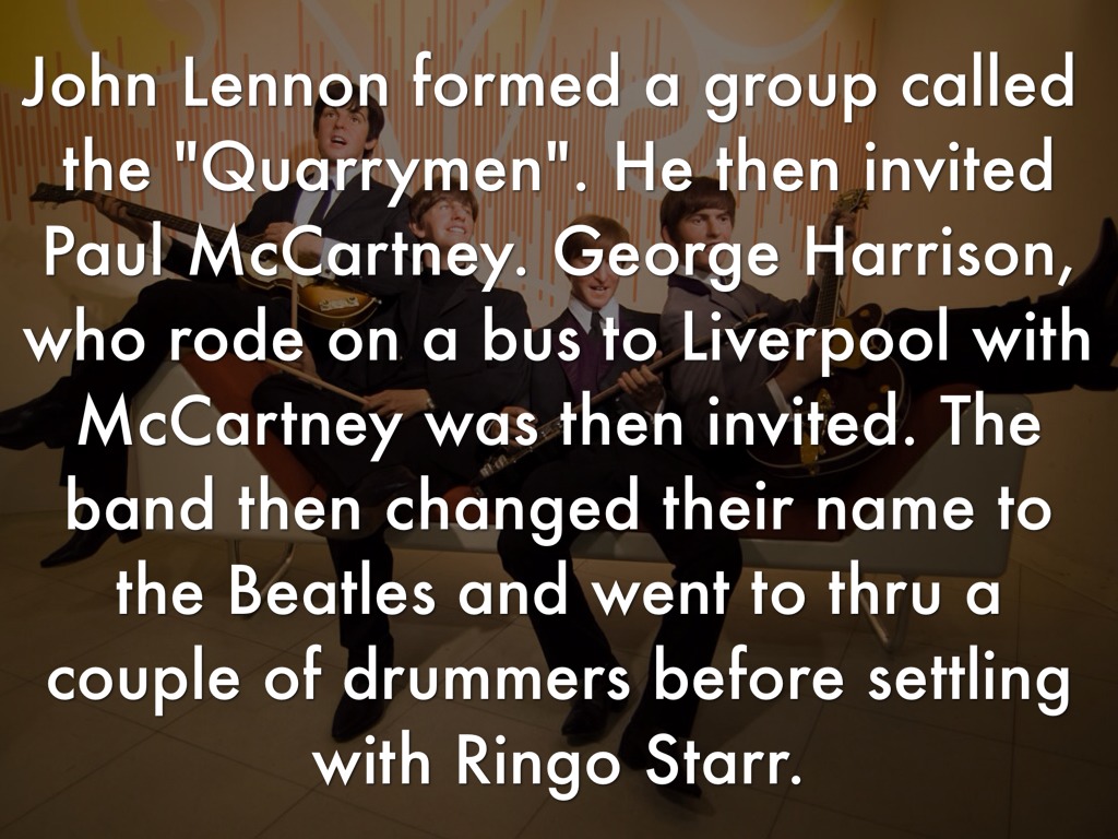 John Lennon formed a group called the "Quarrymen". He then invited Paul McCartney. George Harrison, who rode on a bus to Liverpool with McCartney was then invited. The band then changed their name to the Beatles and went to thru a couple of drummers before settling with Ringo Starr.