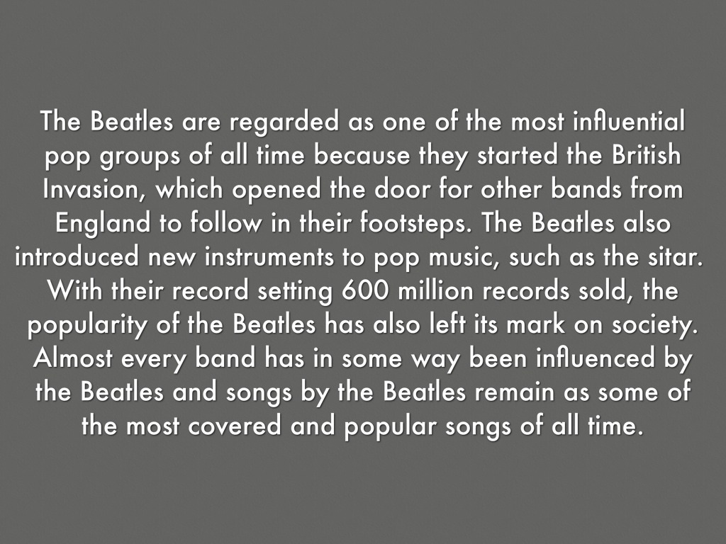 The Beatles are regarded as one of the most influential pop groups of all time because they started the British Invasion, which opened the door for other bands from England to follow in their footsteps. The Beatles also introduced new instruments to pop music, such as the sitar. With their record setting 600 million records sold, the popularity of the Beatles has also left its mark on society. Almost every band has in some way been influenced by the Beatles and songs by the Beatles remain as some of the most covered and popular songs of all time.