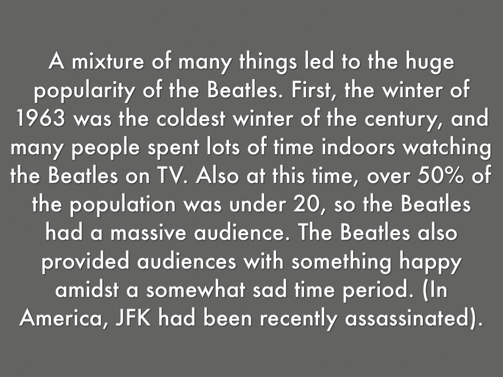 A mixture of many things led to the huge popularity of the Beatles. First, the winter of 1963 was the coldest winter of the century, and many people spent lots of time indoors watching the Beatles on TV. Also at this time, over 50% of the population was under 20, so the Beatles had a massive audience. The Beatles also provided audiences with something happy amidst a somewhat sad time period. (In America, JFK had been recently assassinated).