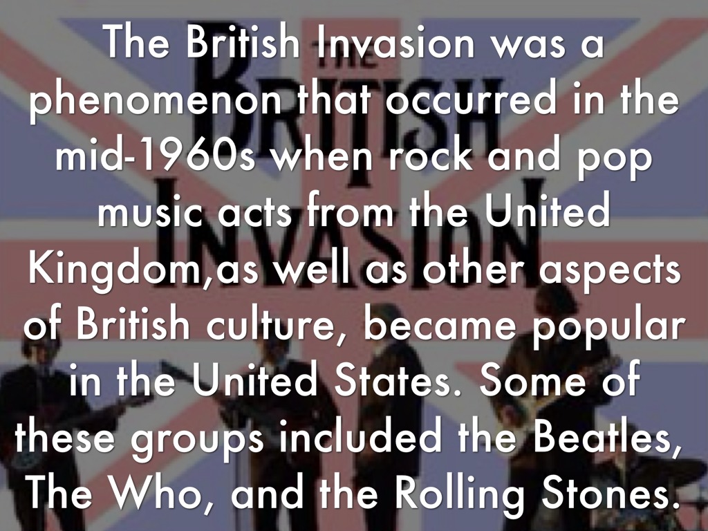 The British Invasion was a phenomenon that occurred in the mid-1960s when rock and pop music acts from the United Kingdom,as well as other aspects of British culture, became popular in the United States. Some of these groups included the Beatles, The Who, and the Rolling Stones.