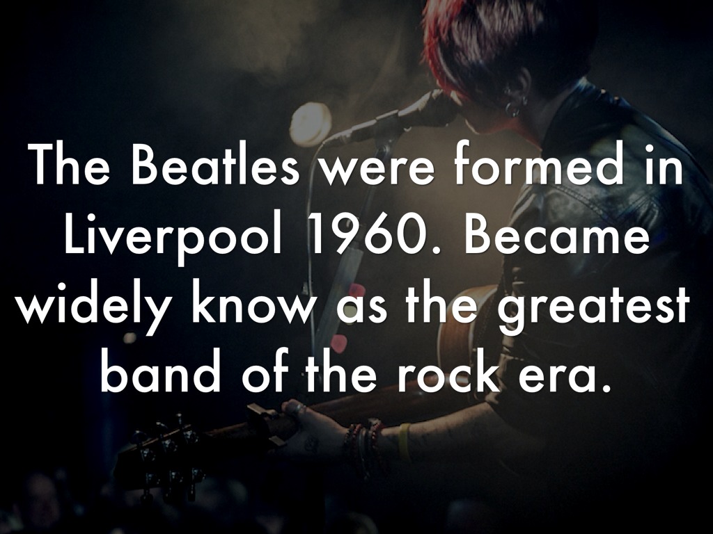 The Beatles were formed in Liverpool 1960. Became widely know as the greatest band of the rock era.