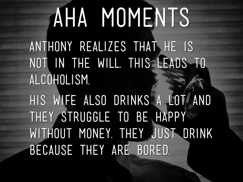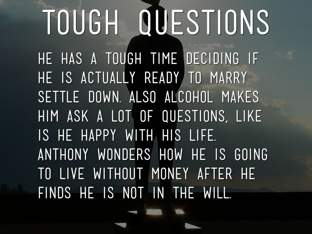 He has a tough time deciding if he is actually ready to marry settle down. Also alcohol makes him ask a lot of questions, like is he happy with his life. Anthony wonders how he is going to live without money after he finds he is not in the will.