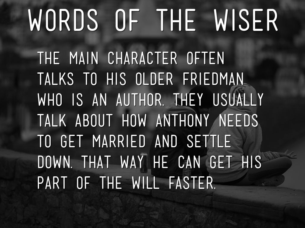 The main character often talks to his older Friedman who is an author. They usually talk about how Anthony needs to get married and settle down. That way he can get his part of the will faster.