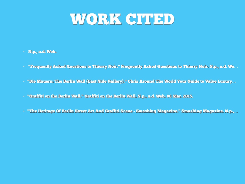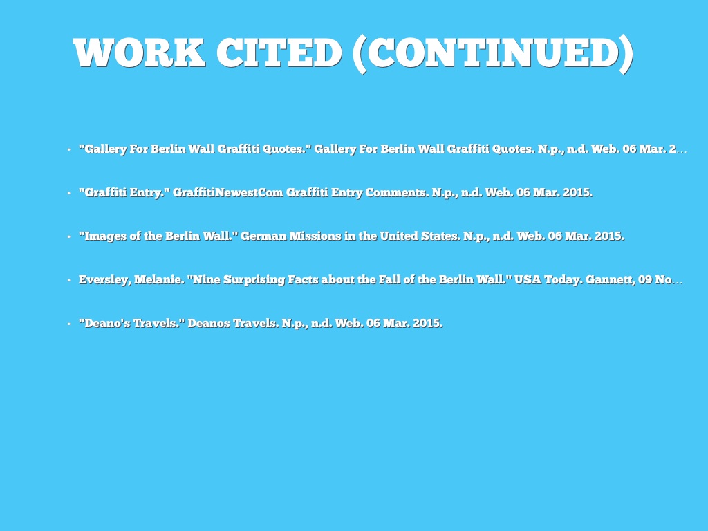 • "Graffiti on the Berlin Wall." Graffiti on the Berlin Wall. N.p., n.d. Web. 06 Mar. 2015.