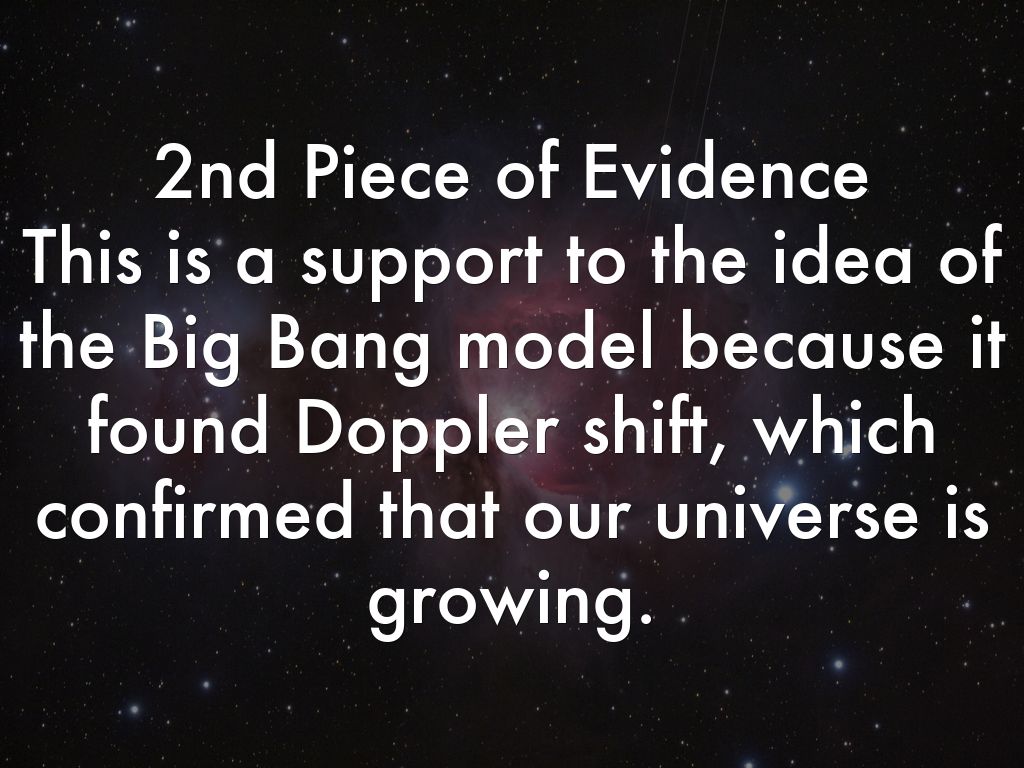 2nd Piece of Evidence This is a support to the idea of the Big Bang model because it found Doppler shift, which confirmed that our universe is growing.