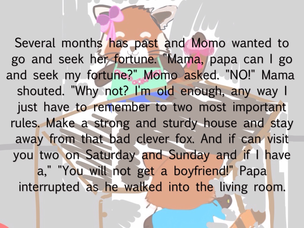 Several months has past and Momo wanted to go and seek her fortune. "Mama, papa can I go and seek my fortune?" Momo asked. "NO!" Mama shouted. "Why not? I'm old enough, any way I just have to remember to two most important rules. Make a strong and sturdy house and stay away from that bad clever fox. And if can visit you two on Saturday and Sunday and if I have a," "You will not get a boyfriend!" Papa interrupted as he walked into the living room.