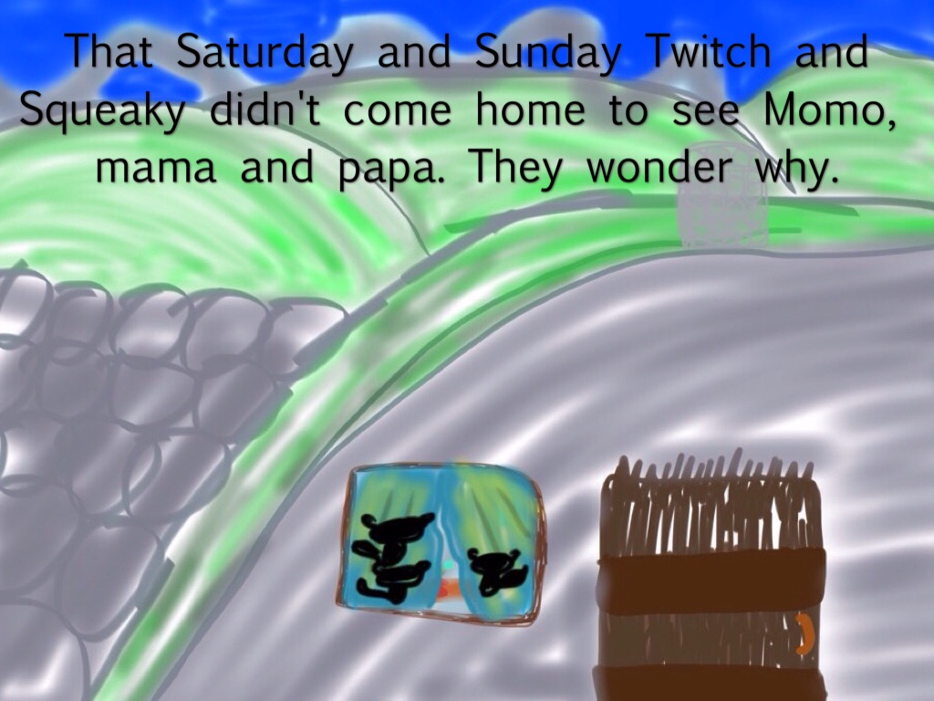 That Saturday and Sunday Twitch and Squeaky didn't come home to see Momo, mama and papa. They wonder why.