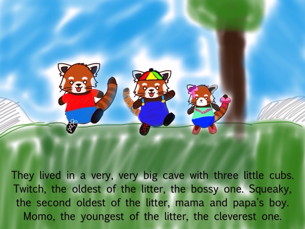They lived in a very, very big cave with three little cubs. Twitch, the oldest of the litter, the bossy one. Squeaky, the second oldest of the litter, mama and papa's boy. Momo, the youngest of the litter, the cleverest one.