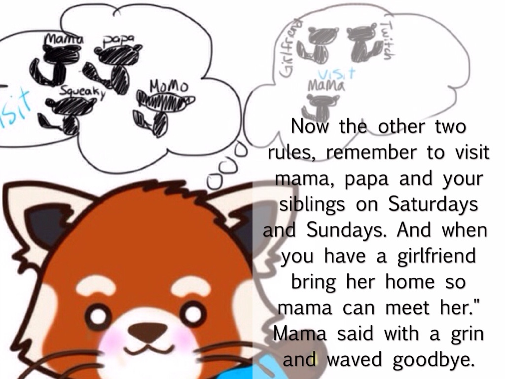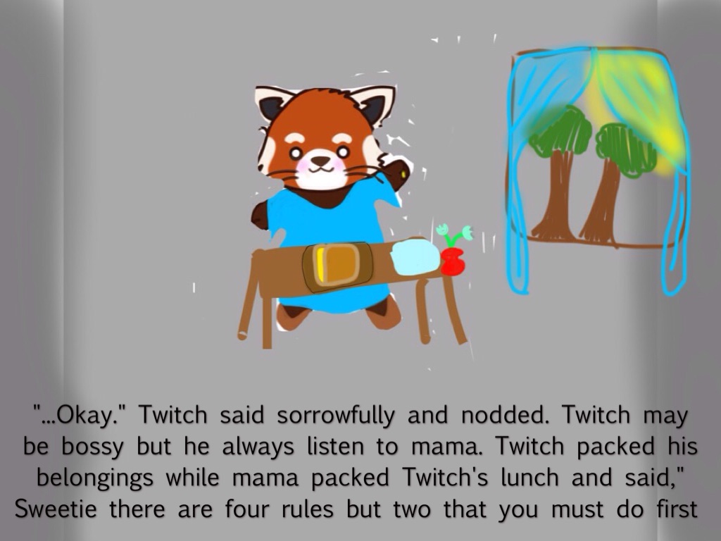 "...Okay." Twitch said sorrowfully and nodded. Twitch may be bossy but he always listen to mama. Twitch packed his belongings while mama packed Twitch's lunch and said," Sweetie there are four rules but two that you must do first