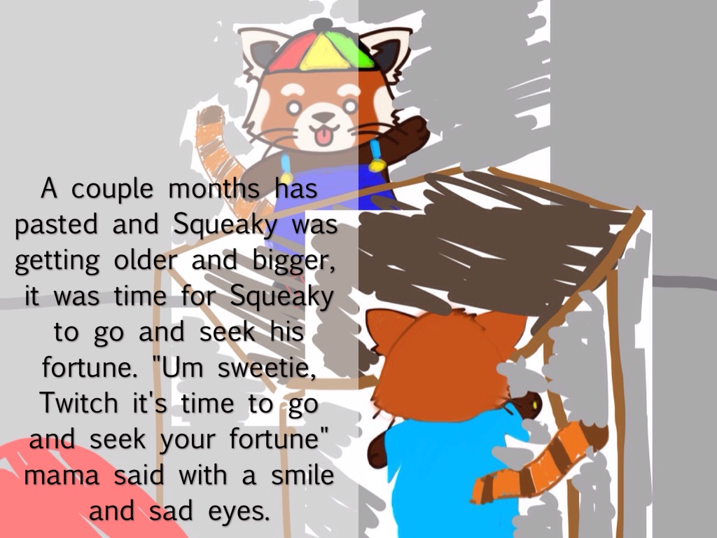 A couple months has pasted and Squeaky was getting older and bigger, it was time for Squeaky to go and seek his fortune. "Um sweetie, Twitch it's time to go and seek your fortune" mama said with a smile and sad eyes.
