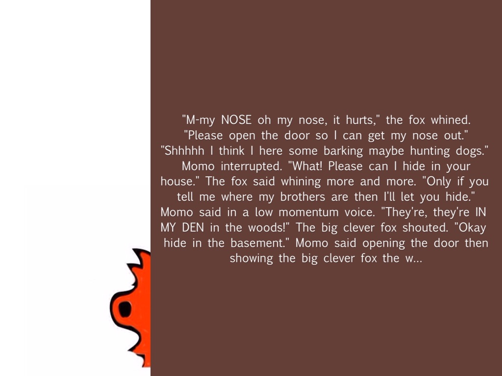 "M-my NOSE oh my nose, it hurts," the fox whined. "Please open the door so I can get my nose out." "Shhhhh I think I here some barking maybe hunting dogs." Momo interrupted. "What! Please can I hide in your house." The fox said whining more and more. "Only if you tell me where my brothers are then I'll let you hide." Momo said in a low momentum voice. "They're, they're IN MY DEN in the woods!" The big clever fox shouted. "Okay hide in the basement." Momo said opening the door then showing the big clever fox the way.
