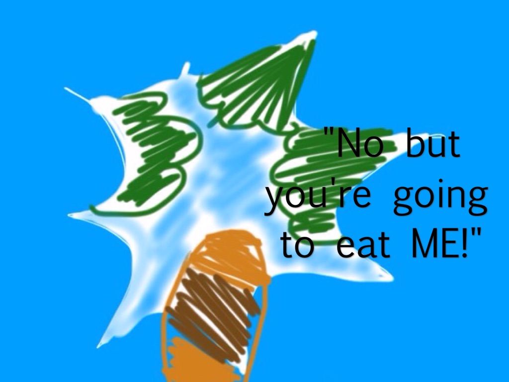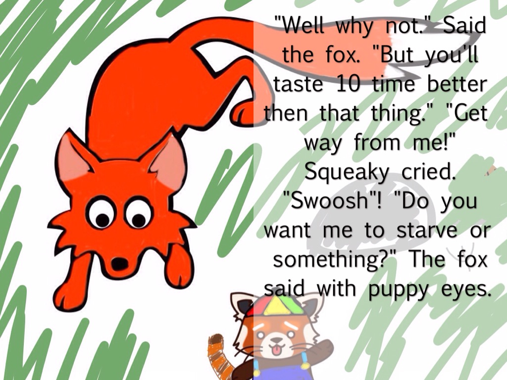 "Well why not." Said the fox. "But you'll taste 10 time better then that thing." "Get way from me!" Squeaky cried. "Swoosh"! "Do you want me to starve or something?" The fox said with puppy eyes.