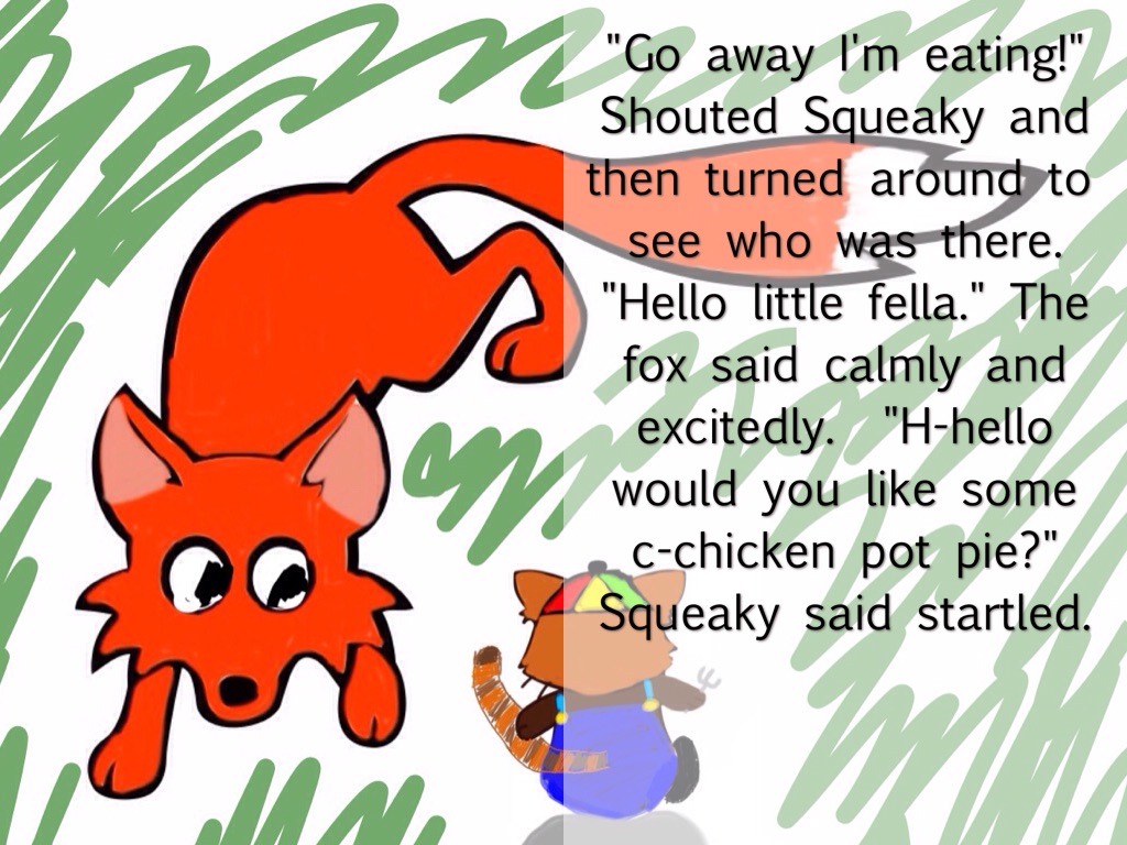 "Go away I'm eating!" Shouted Squeaky and then turned around to see who was there. "Hello little fella." The fox said calmly and excitedly. "H-hello would you like some c-chicken pot pie?" Squeaky said startled.