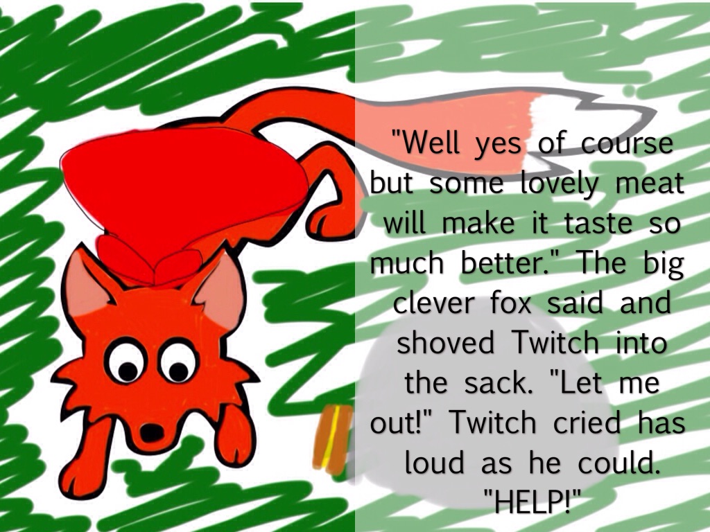 "Well yes of course but some lovely meat will make it taste so much better." The big clever fox said and shoved Twitch into the sack. "Let me out!" Twitch cried has loud as he could. "HELP!"