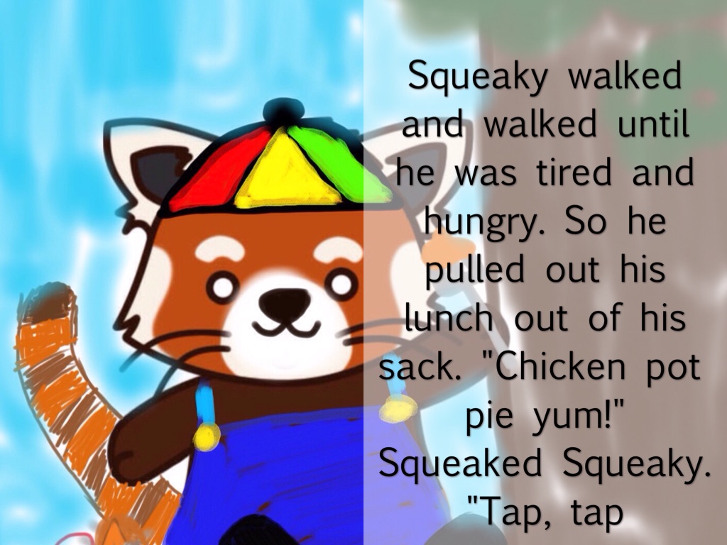 Squeaky walked and walked until he was tired and hungry. So he pulled out his lunch out of his sack. "Chicken pot pie yum!" Squeaked Squeaky. "Tap, tap