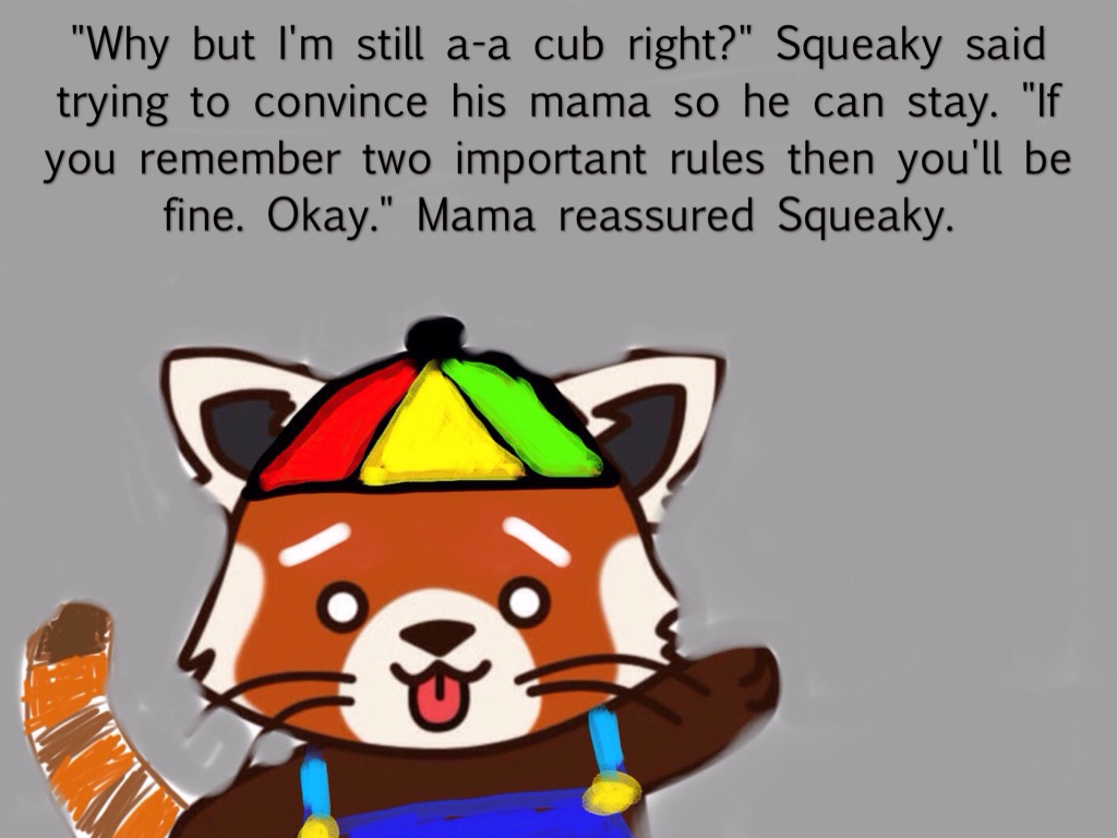 "Why but I'm still a-a cub right?" Squeaky said trying to convince his mama so he can stay. "If you remember two important rules then you'll be fine. Okay." Mama reassured Squeaky.