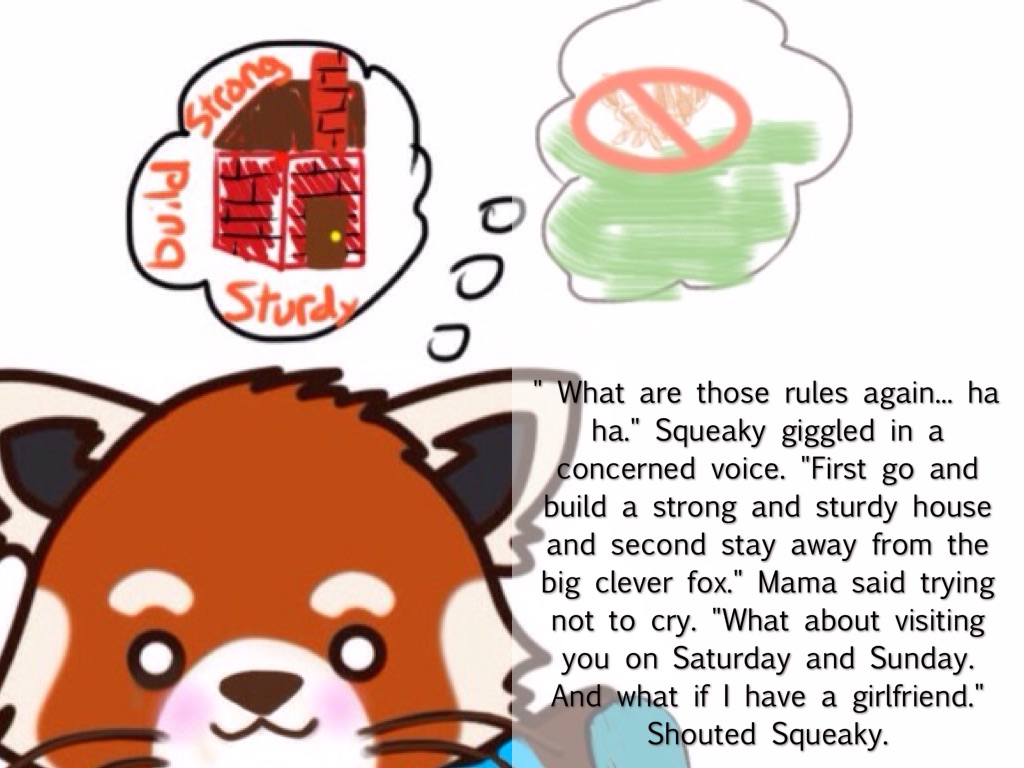 " What are those rules again... ha ha." Squeaky giggled in a concerned voice. "First go and build a strong and sturdy house and second stay away from the big clever fox." Mama said trying not to cry. "What about visiting you on Saturday and Sunday. And what if I have a girlfriend." Shouted Squeaky.