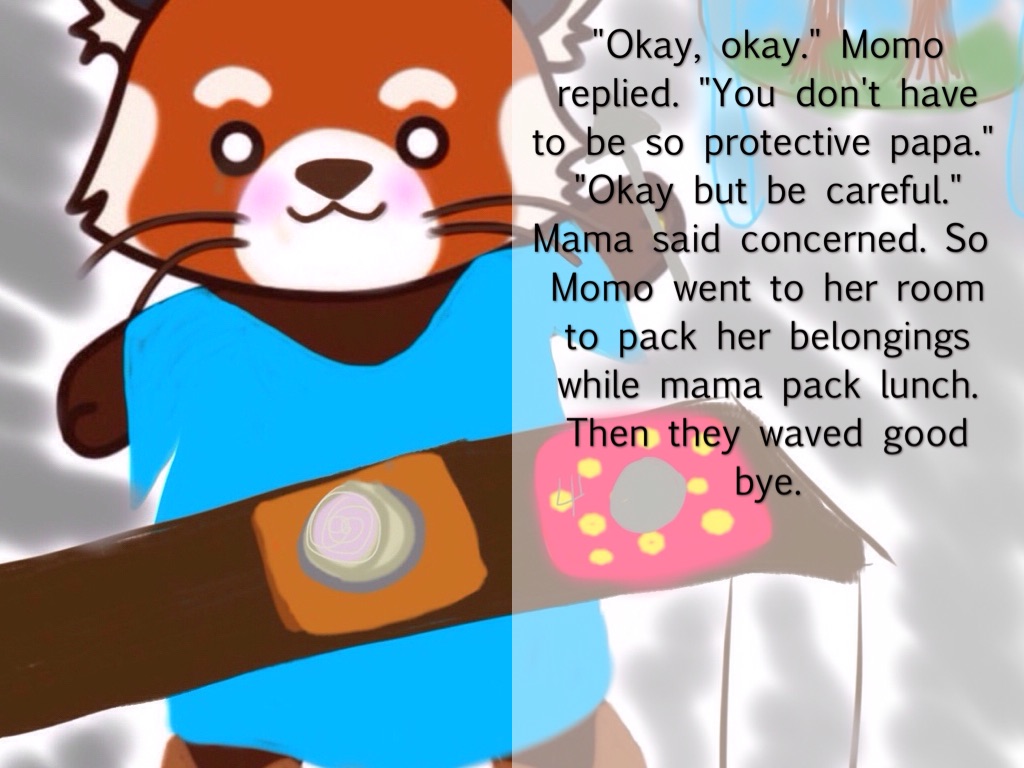 "Okay, okay." Momo replied. "You don't have to be so protective papa." "Okay but be careful." Mama said concerned. So Momo went to her room to pack her belongings while mama pack lunch. Then they waved good bye.