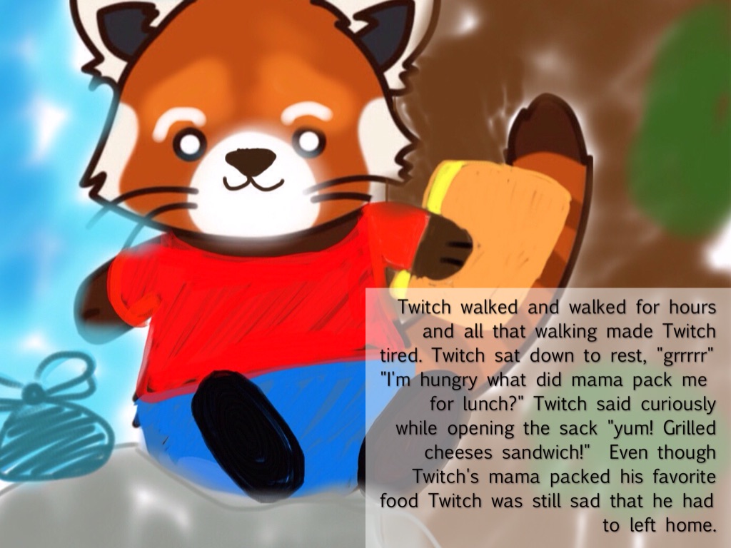 Twitch walked and walked for hours and all that walking made Twitch tired. Twitch sat down to rest, "grrrrr" "I'm hungry what did mama pack me for lunch?" Twitch said curiously while opening the sack "yum! Grilled cheeses sandwich!" Even though Twitch's mama packed his favorite food Twitch was still sad that he had to left home.
