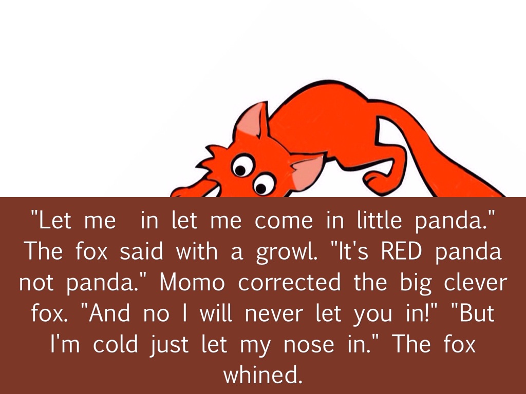 "Let me in let me come in little panda." The fox said with a growl. "It's RED panda not panda." Momo corrected the big clever fox. "And no I will never let you in!" "But I'm cold just let my nose in." The fox whined.