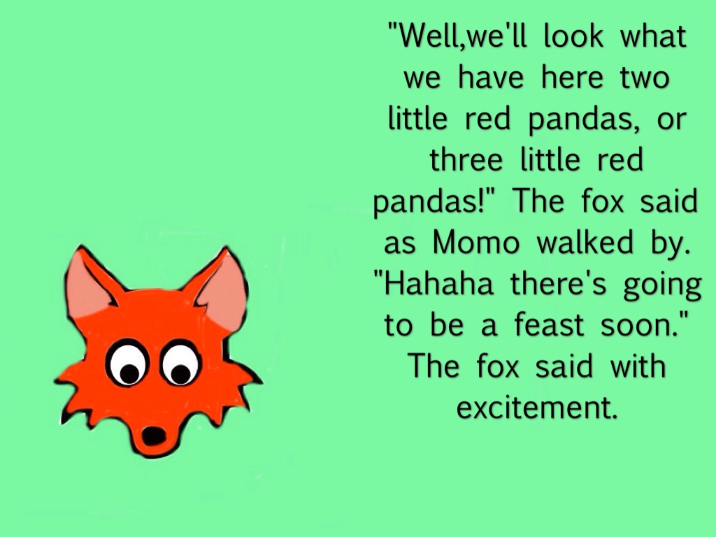 "Well,we'll look what we have here two little red pandas, or three little red pandas!" The fox said as Momo walked by. "Hahaha there's going to be a feast soon." The fox said with excitement.