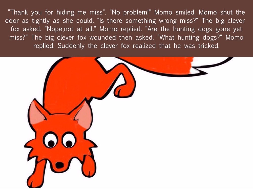"Thank you for hiding me miss". "No problem!" Momo smiled. Momo shut the door as tightly as she could. "Is there something wrong miss?" The big clever fox asked. "Nope,not at all." Momo replied. "Are the hunting dogs gone yet miss?" The big clever fox wounded then asked. "What hunting dogs?" Momo replied. Suddenly the clever fox realized that he was tricked.