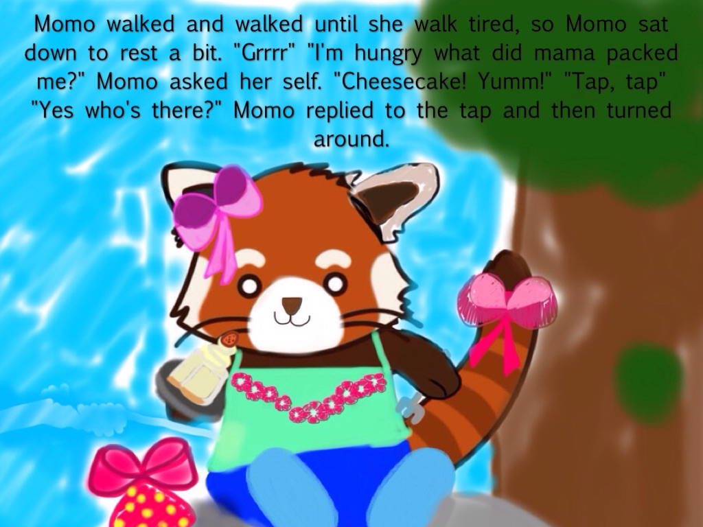 Momo walked and walked until she walk tired, so Momo sat down to rest a bit. "Grrrr" "I'm hungry what did mama packed me?" Momo asked her self. "Cheesecake! Yumm!" "Tap, tap" "Yes who's there?" Momo replied to the tap and then turned around.