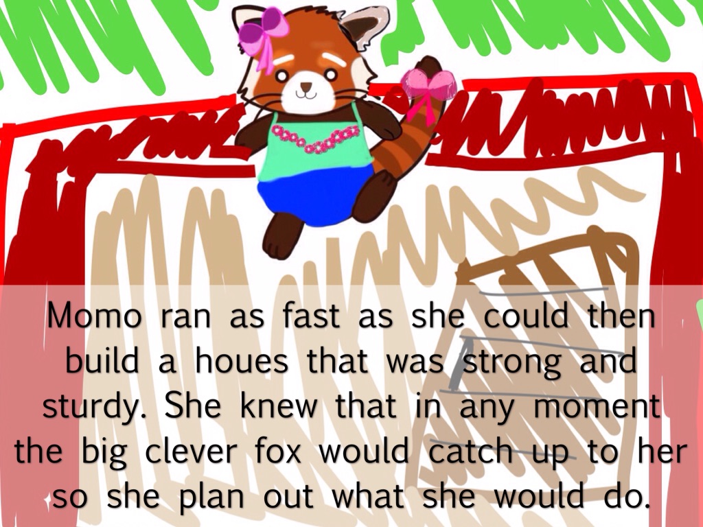 Momo ran as fast as she could then build a houes that was strong and sturdy. She knew that in any moment the big clever fox would catch up to her so she plan out what she would do.