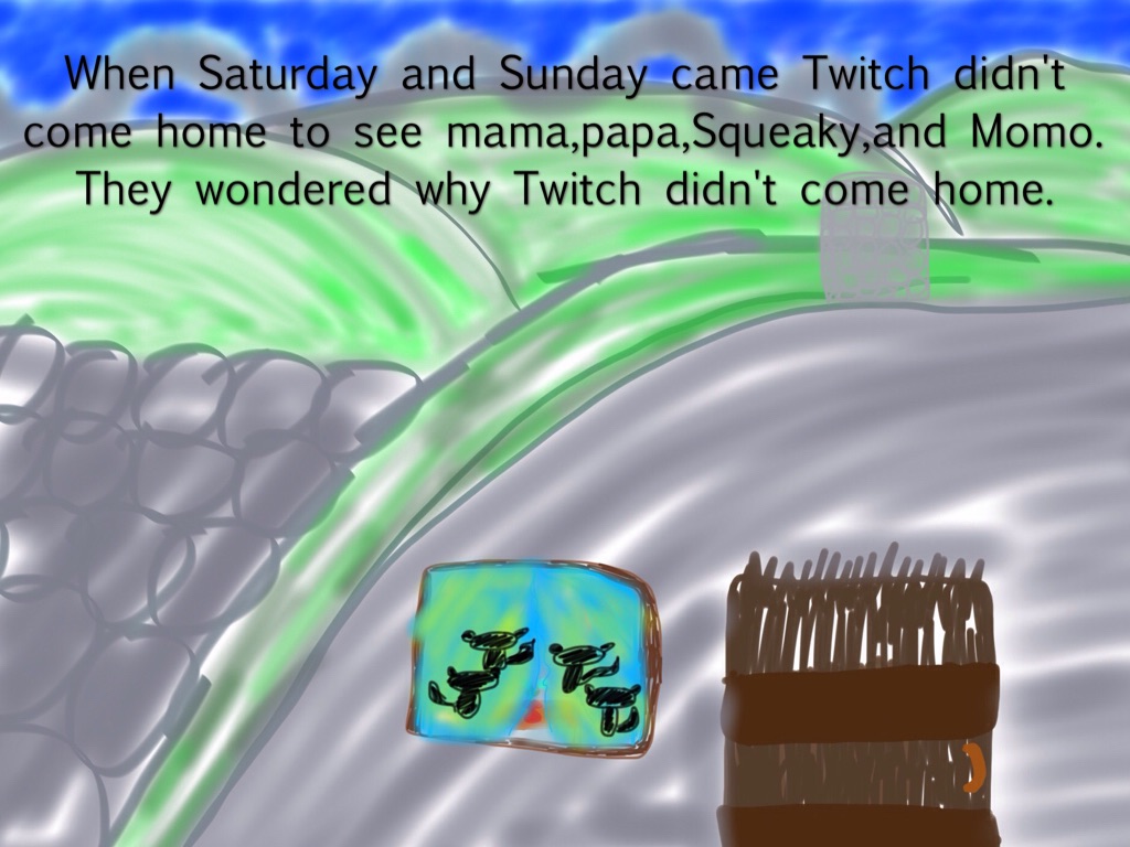 When Saturday and Sunday came Twitch didn't come home to see mama,papa,Squeaky,and Momo. They wondered why Twitch didn't come home.