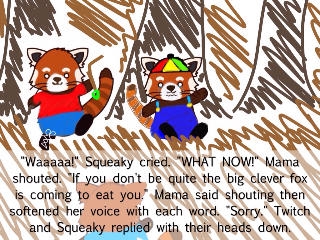 "Waaaaa!" Squeaky cried. "WHAT NOW!" Mama shouted. "If you don't be quite the big clever fox is coming to eat you." Mama said shouting then softened her voice with each word. "Sorry." Twitch and Squeaky replied with their heads down.