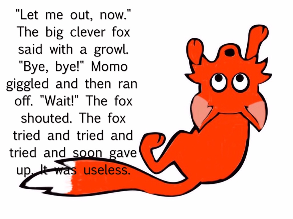 "Let me out, now." The big clever fox said with a growl. "Bye, bye!" Momo giggled and then ran off. "Wait!" The fox shouted. The fox tried and tried and tried and soon gave up. It was useless.