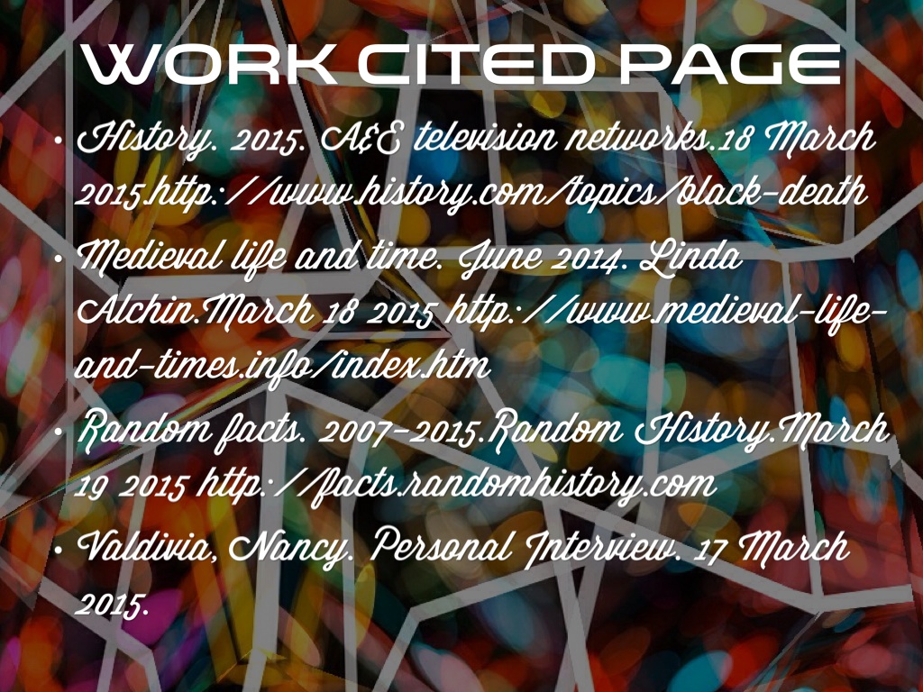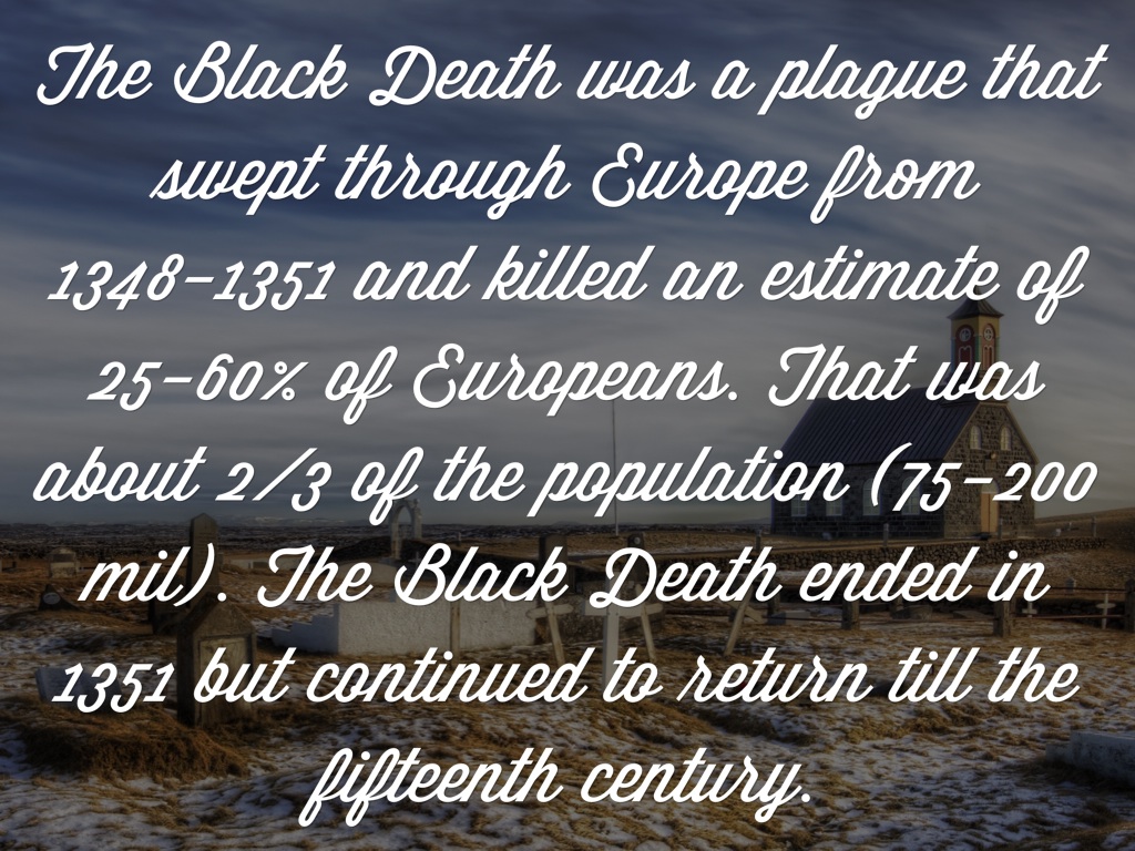 The Black Death was a plague that swept through Europe from 1348-1351 and killed an estimate of 25-60% of Europeans. That was about 2/3 of the population (75-200 mil). The Black Death ended in 1351 but continued to return till the fifteenth century.