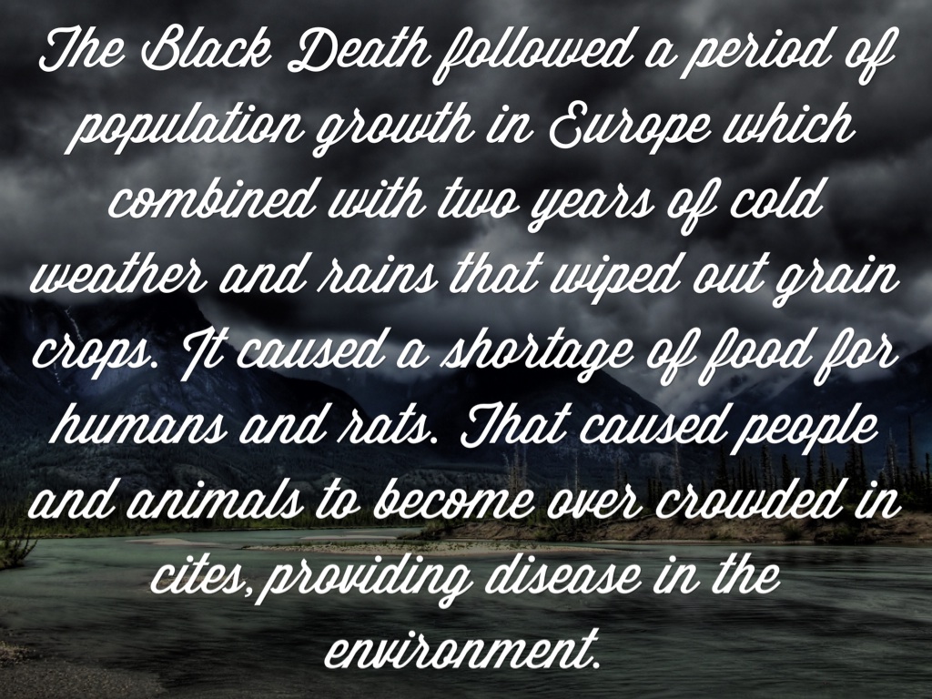 The Black Death followed a period of population growth in Europe which combined with two years of cold weather and rains that wiped out grain crops. It caused a shortage of food for humans and rats. That caused people and animals to become over crowded in cites, providing disease in the environment.