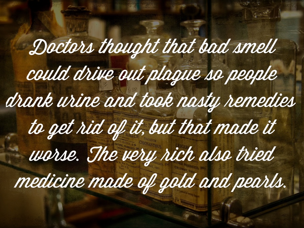 Doctors thought that bad smell could drive out plague so people drank urine and took nasty remedies to get rid of it, but that made it worse. The very rich also tried medicine made of gold and pearls.