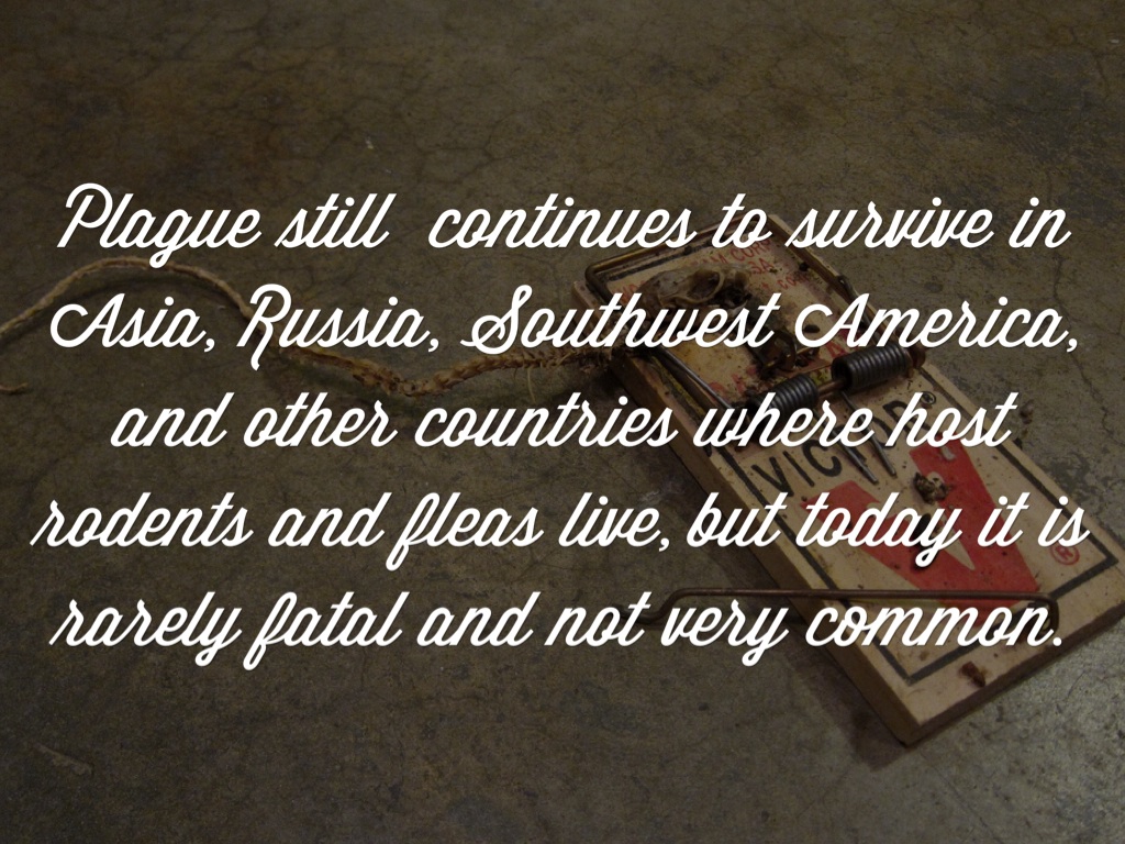 Plague still continues to survive in Asia, Russia, Southwest America, and other countries where host rodents and fleas live, but today it is rarely fatal and not very common.