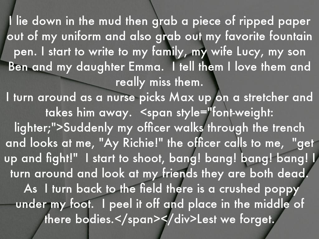 I lie down in the mud then grab a piece of ripped paper out of my uniform and also grab out my favorite fountain pen. I start to write to my family, my wife Lucy, my son Ben and my daughter Emma. I tell them I love them and really miss them. I turn around as a nurse picks Max up on a stretcher and takes him away. Suddenly my officer walks through the trench and looks at me, "Ay Richie!" the officer calls to me, "get up and fight!" I start to shoot, bang! bang! bang! bang! I turn around and look at my friends they are both dead. As I turn back to the field there is a crushed poppy under my foot. I peel it off and place in the middle of there bodies.Lest we forget.
