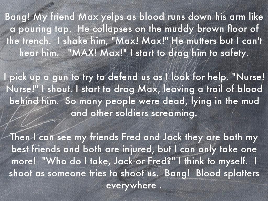 Bang! My friend Max yelps as blood runs down his arm like a pouring tap. He collapses on the muddy brown floor of the trench. I shake him, "Max! Max!" He mutters but I can't hear him. "MAX! Max!" I start to drag him to safety.