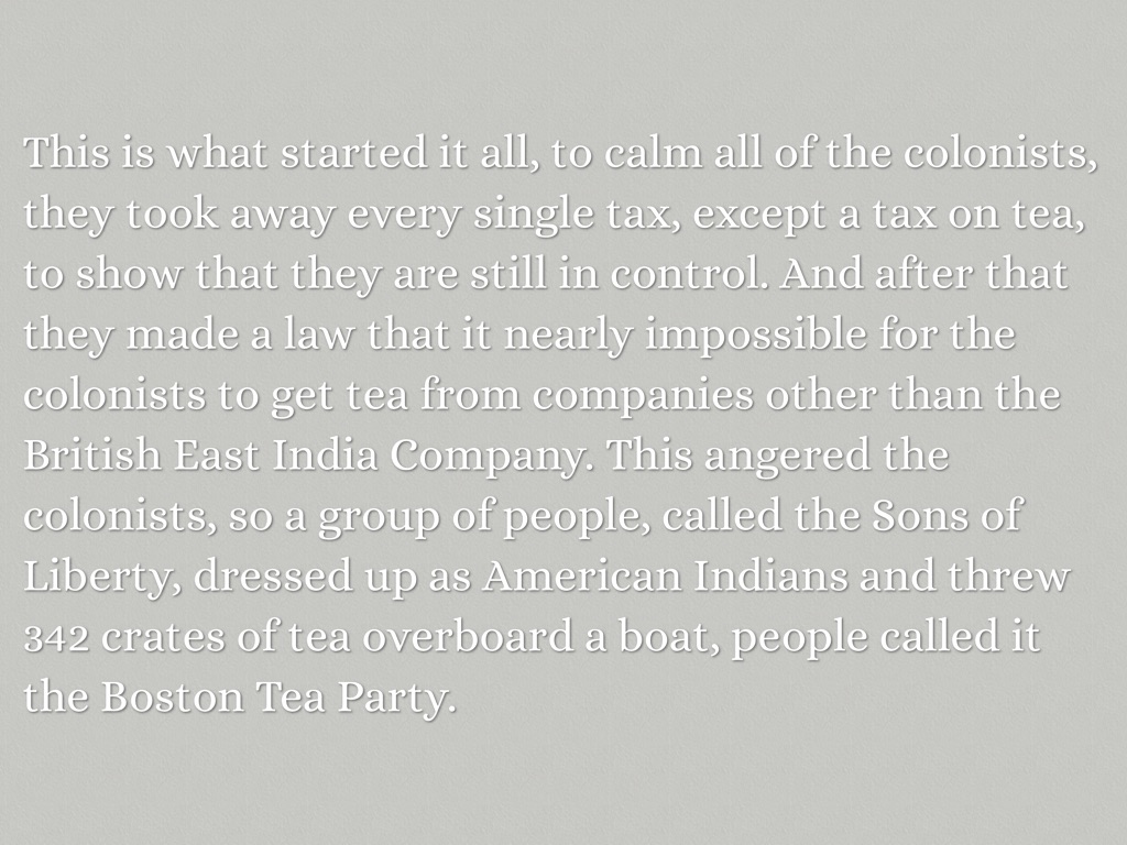 This is what started it all, to calm all of the colonists, they took away every single tax, except a tax on tea, to show that they are still in control. And after that they made a law that it nearly impossible for the colonists to get tea from companies other than the British East India Company. This angered the colonists, so a group of people, called the Sons of Liberty, dressed up as American Indians and threw 342 crates of tea overboard a boat, people called it the Boston Tea Party.