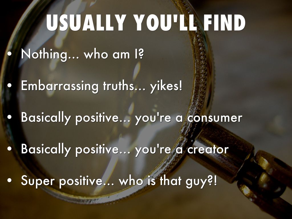 Who are you? Who are you really? And whom would you like to be? When you apply to college or for a job (or go on a date), you work to present the you you'd really like to be. And your digital footprint represents an image of who you seem to be.