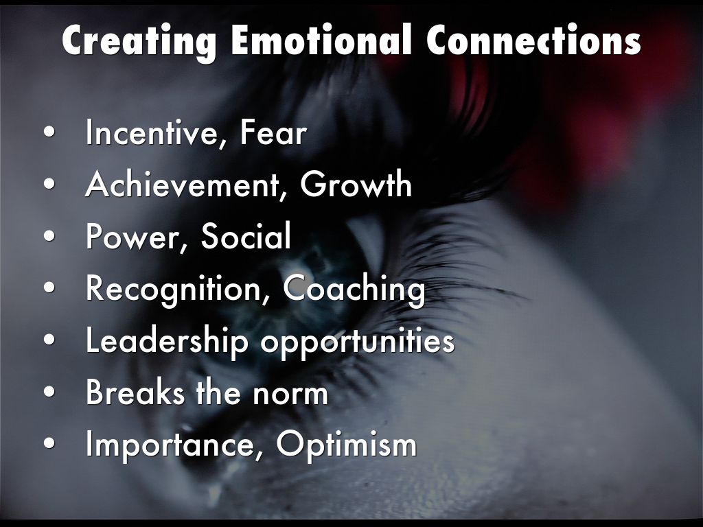A range of motivators exist to stimulate action. A great leader understands how to use each of the influencers to retain an established emotional connection to the goal being worked on. See this list of considerations for a manager to include: