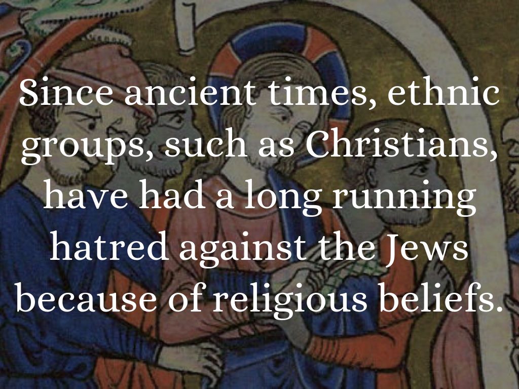 Since ancient times, ethnic groups, such as Christians, have had a long running hatred against the Jews because of religious beliefs.