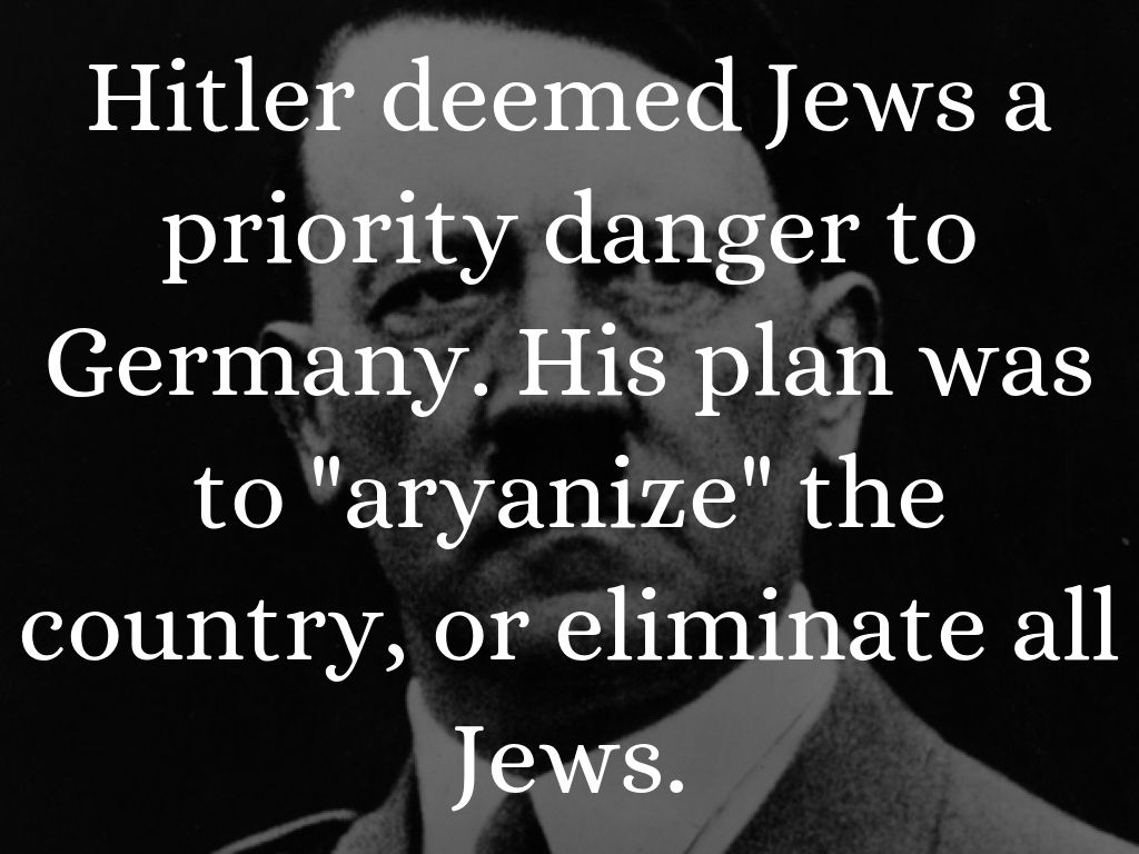 Hitler deemed Jews a priority danger to Germany. His plan was to "aryanize" the country, or eliminate all Jews.