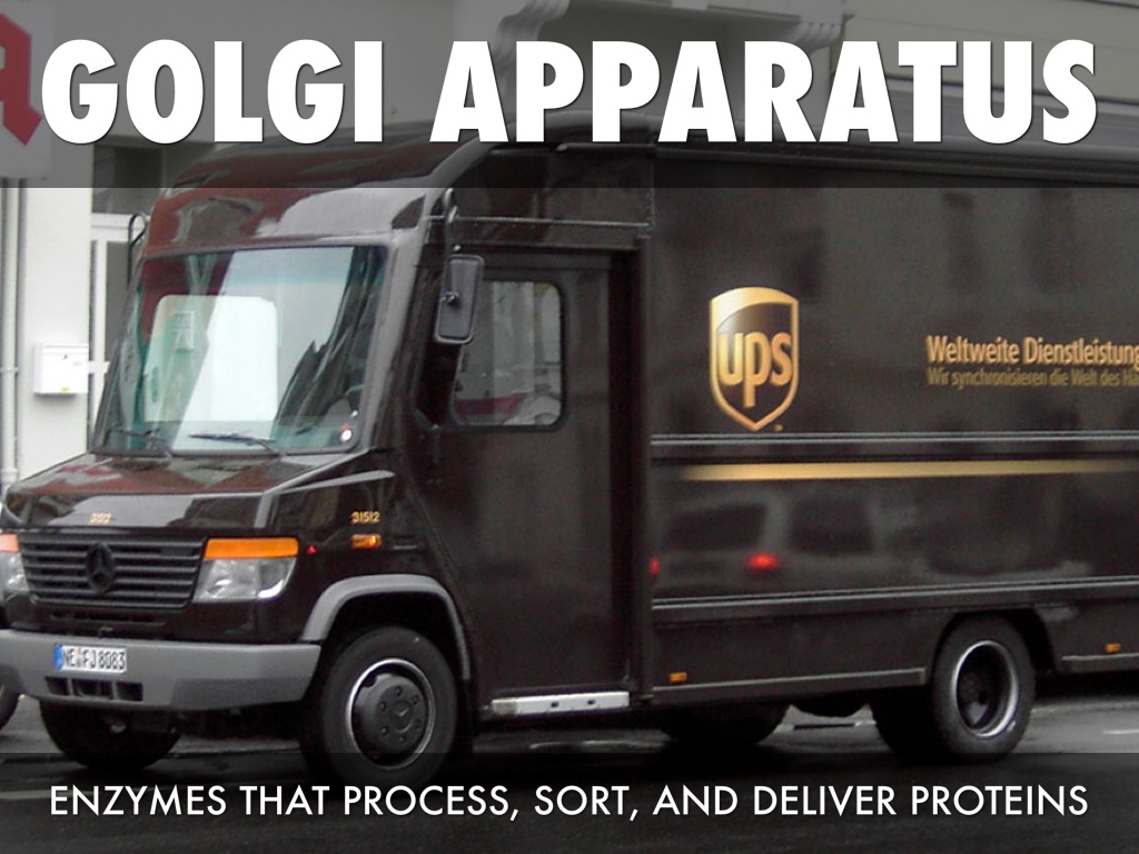 We chose UPS and other mail delivery services to represent the Golgi apparatus because it ships and processes your order and delivers it to you. Just like how the Golgi apparatus processes, sorts, and delivers proteins.