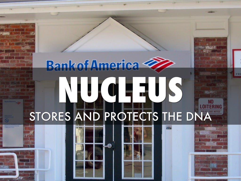 The bank stores and protects the community's money, like the nucleus stores and protects DNA.